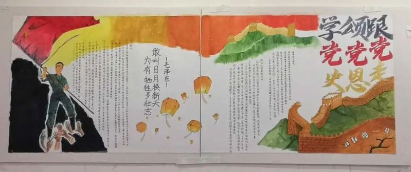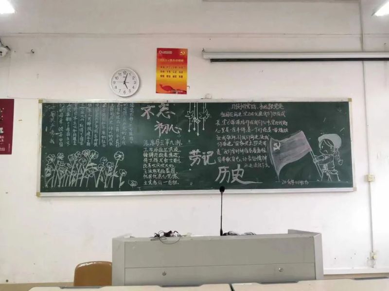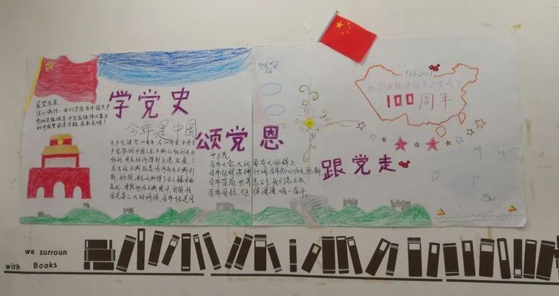 各班同学利用课后时间,发挥创造力和想象力,认真装扮教室,将党史的事故融入其中,营造良好的党史学习氛围。