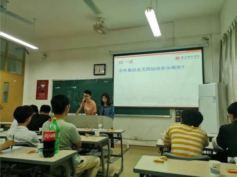 19化学2班主持人表示:1919年五月,中国热血青年作为一支新生的社会力量登上历史舞台,掀起了伟大的五四爱国主义运动。五四运动是中国新民主主义革命的开始,是一次彻底的反对帝国主义和封建主义的爱国运动。五四精神是忧国忧民,是热爱祖国,是积极创新,是探索科学的爱国主义精神。践行五四精神,努力学习,成为祖国之栋梁,奔向美好的明天。
