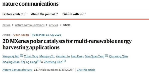 近日,国际顶级期刊《Nature》子刊:《Nature Communications》(IF:16.6,中科院一区,TOP期刊,H指数248)在线发表我校化工与材料学院潘晓阳教授团队的研究论文“2D MXenes polar catalysts for multi-renewable energy harvesting applications”。我校为第一署名单位,潘晓阳教授为论文的第一以及通讯作者。福建师范大学杨民权教授、福州大学梁诗景教授和上海师范大学卞振锋教授为共同通讯作者。