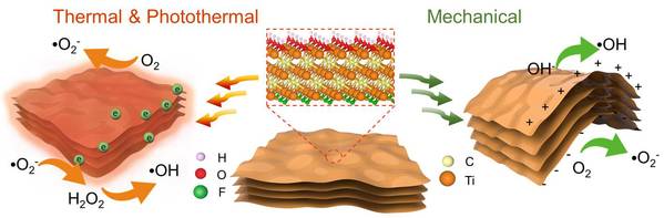 可再生能源利用技术是解决能源与环境问题的有效途径。然而,可再生能源存在很大的不稳定性,高度依赖于季节、气候和地理位置。因此,单一的可再生能源利用技术在实际应用中存在很大局限,亟需发展一种多能源协同利用的技术。针对这一问题,潘晓阳教授团队采用理论模拟的方式,验证了二维MXene材料可以用作机械能(振动能、水流能)、光能、热能等多种可再生能源协同利用的潜在候选材料。接着,团队采用污染物降解和催化制氢两个典型的催化反应验证了催化剂的多功能催化性能。研究发现,催化剂在声波振动、水流、环境热源和太阳光照射下均能有效的驱动催化反应,其催化性能超过了大多数已报道的催化剂,并且多种能源之间存在着显著的耦合效应。