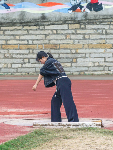 铅球是一项对力量和技巧都要求极高的运动,既要求运动员具备极强的爆发力,又需要运动员具有一定的腰腹协调性。一次次的投掷训练只为了不断刷新自己投掷的最远距离,只为了划出那一道最优美的弧线。蔡楚楚同学表示,这次运动会是一次机会,既然我抓住了这次机会,我一定全力以赴,在运动会的赛场上展现更好的自己。