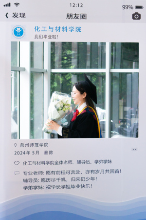 我院利用一学期的时间,组织来自不同专业的学弟学妹录制毕业祝福微视频,向即将毕业的学长学姐送上毕业祝福,鼓励化院学子勇担时代使命,矢志奋斗。