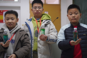 在油水烟花实验环节,实践队员先是以通俗易懂的方式为小记者们阐释春节烟花燃放蕴含的化学原理,让他们知道原来生活中的诸多现象都可以用化学原理来解释。活动现场不能燃放于空中绽放绚烂色彩的烟花,却可以用另一种化学原理将烟花在小小的溶剂瓶中实现。基于油和水不相溶以及相似相溶的特性,实践队员解释道,色素会选择性地溶于油中,且由于油和水的密度差异,当把混合了色素的油倒入水中时,色素随着油滴下沉并在水中扩散,如同烟花在空中绽放般绚烂。在队员们的悉心指导下,小记者们全神贯注地操作实验器具,当看到自己亲手打造的“烟花” 在水中绚烂盛开的那一刻,他们的眼中闪烁着兴奋与好奇的光芒,对化学的兴趣也在这一瞬间被点燃。