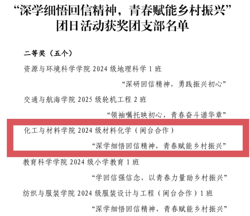 为深入学习贯彻习近平总书记给福建农林大学全体师生的重要回信精神,引导广大团员和青年深刻领悟重要回信精神的丰富内涵与核心要义,在校团委组织的“深学细悟回信精神,青春赋能乡村振兴”主题团日活动中,我院2024级材料化学(闽台合作)团支部获得二等奖。