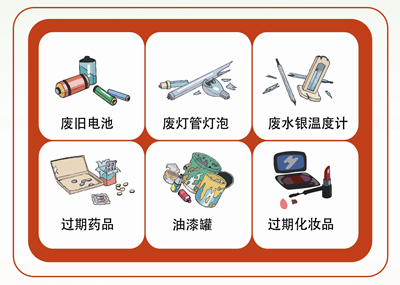 1.主要品种。包括:废电池(镉镍电池、氧化汞电池、铅蓄电池等),废荧光灯管(日光灯管、节能灯等),废温度计,废血压计,废药品及其包装物,废油漆、溶剂及其包装物,废杀虫剂、消毒剂及其包装物,废胶片及废相纸等。学校里的有害垃圾通常有废灯管、打印机墨盒、硒鼓和胶卷相片等。