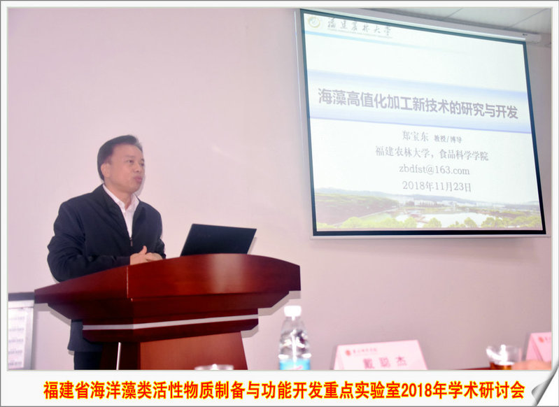 24日,“福建省海洋藻类活性物质制备与功能开发重点实验室”2018年学术研讨会在宝龙实验楼449会议室正式召开。英国威廉希尔公司官网科研处处长戴聪杰教授代表学校表达了对学院发展和重点实验室建设的支持。泉州市海洋渔业局黄前程副局长出席了本次会议,并为学院重点实验室建设和发展提供了各方面支持,同时大力促进了地方校企合作。重点实验室负责人戴聪杰教授对“福建省海洋藻类活性物质制备与功能开发重点实验室”进行了工作总结及来年计划的汇报。福建农林大学副校长郑宝东教授作了题为“海藻高值化加工技术的研究与开发”的专题报告,对海藻深加工技术进行了简要介绍,并对低熔点琼脂制备、海藻新型糖类功效因子结构特征及功能解析等内容进行了分享。在报告结尾,郑副校长也对重点实验室的建设提出了“必须以学科为支撑,争取申请硕士点,可先申请专业硕士点”等宝贵建议。