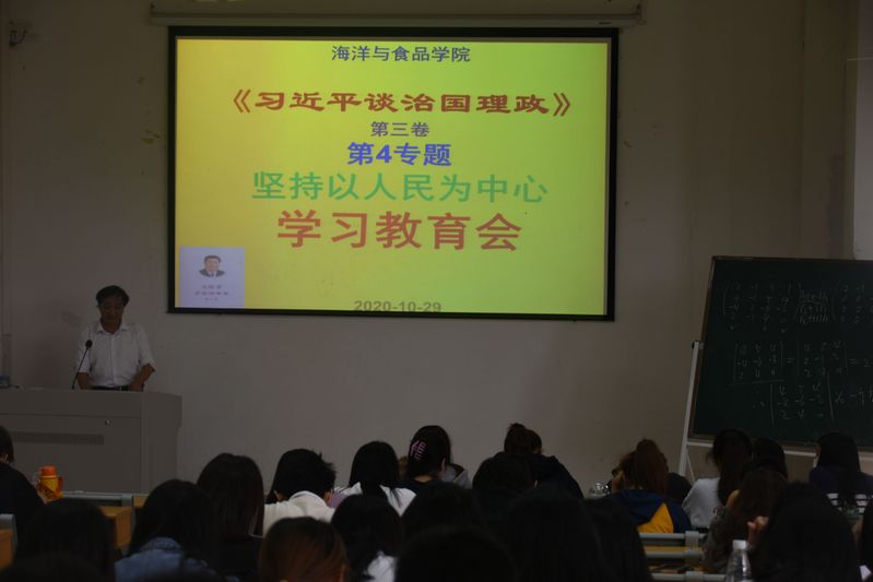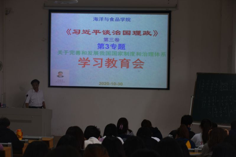 10月30日,海洋与食品学院师生在理工楼320教室组织学习《习近平谈治国理政》第三卷第3专题和第4专题。学院党委书记蔡英卿教授主持学习活动。