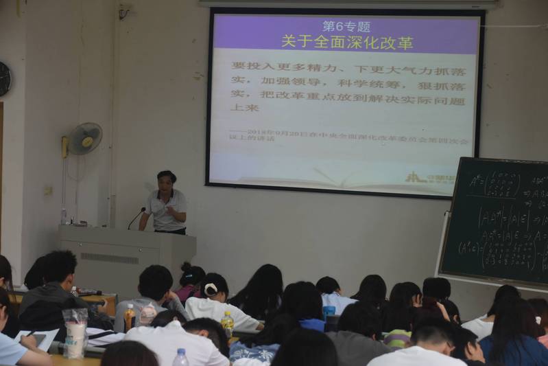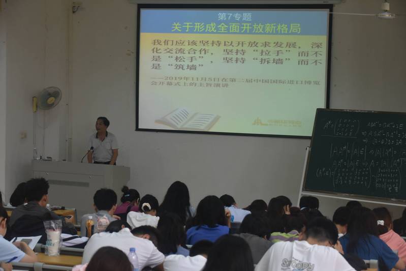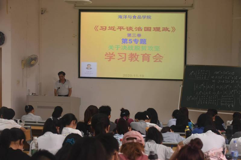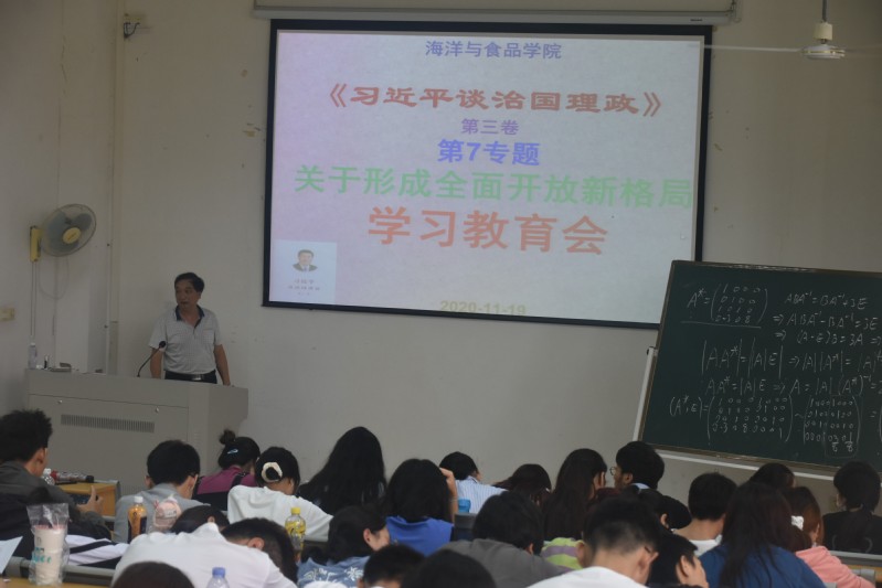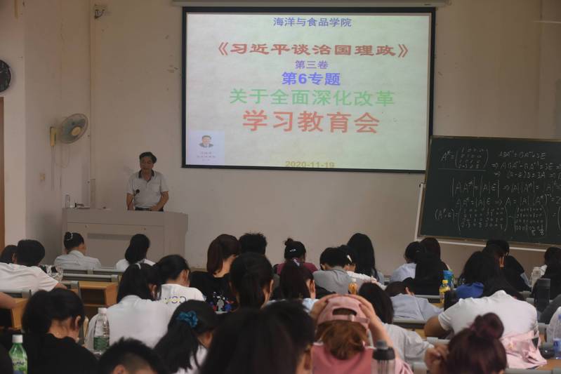 11月19日,海洋与食品学院师生在理工楼320教室学习《习近平谈治国理政》第三卷第5专题、第6专题和第7专题。学院党委书记蔡英卿教授主持学习教育会,学院全体教职工、学生党员和主要学生干部参加学习。