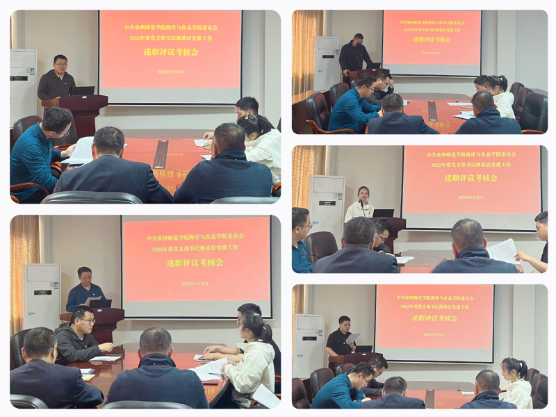 3月15日,海洋与食品学院党委在会议室召开2022年度党支部书记抓基层党建工作述职评议考核会。会议由党委书记蔡志荣主持,副书记刘礼元、党委委员、各党支部书记参加会议。