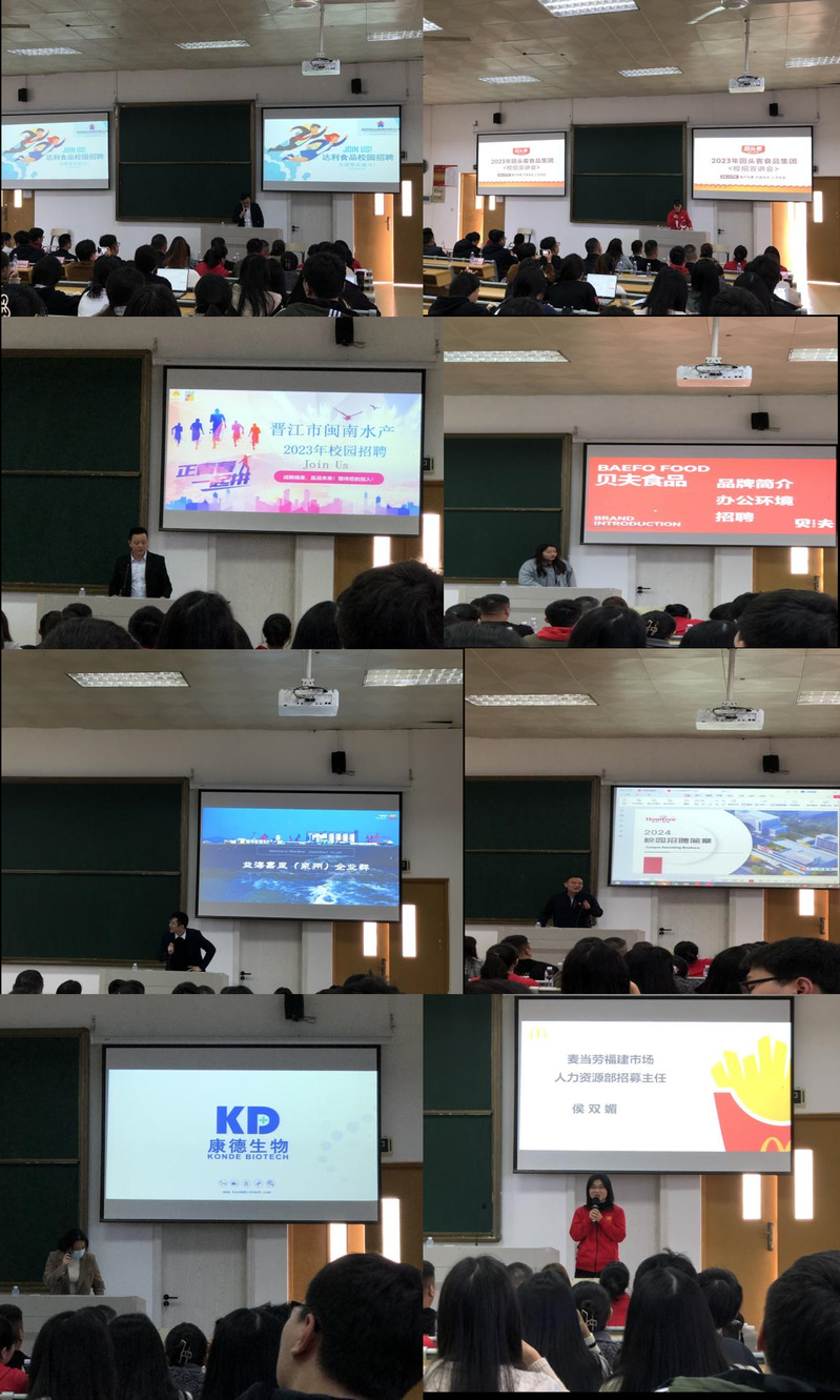 宣讲会上,达利食品、益海嘉里、金拱门、闽南水产等12家企业分别从公司概况、发展理念、岗位类型、薪资待遇、职业前景等方面做了主题宣讲,同时宣讲人还结合亲身经历讲述了求职经历和就业后的真实感受,勉励同学们树立明确的择业方向,脚踏实地、敢于尝试。