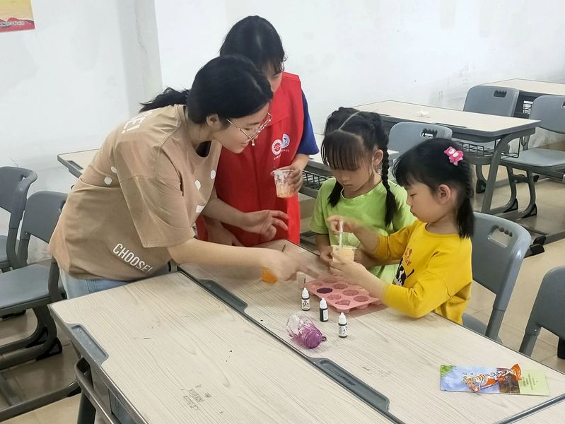 随后,我院学生会组织志愿者带领孩子们来到学院理工楼320,开启手工皂制作之旅。在详尽介绍手工皂的成分、原理与制作步骤后,组织志愿者们将皂基、调色颜料及模具等材料一一分发给孩子们,并热情引导他们锤捣皂体、精心压模,贴上属于自己的标签。在欢乐的氛围中,孩子们兴奋地交流着彼此的想法与创意,共同期待手工皂脱模,最终创造出属于自己的独特作品。
