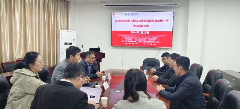 1月16日,泉州市海洋与渔业局局长潘华培、副局长蔡茂庆和海洋经济科科长尤俊达一行到我院开展调研座谈。学院党委书记蔡志荣、副院长梁鹏教授及学院部分教师代表出席调研座谈会。