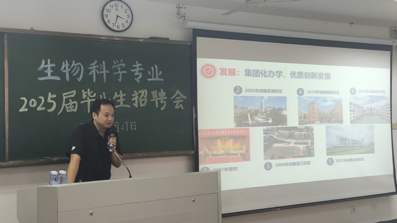 为进一步促进学院2025届生物科学专业毕业生高质量就业,搭建毕业生与用人单位的沟通桥梁,3月27日下午,海洋与食品学院生物科学专业2025届毕业生招聘会在荣茂301举办。本次招聘会邀请了泉州科技中学、南安市本真高级中学、泉州实验中学、福清京师学校、智学堂教育等五所学校前来开展招聘宣讲,吸引了众多毕业生踊跃参与。学院党委书记蔡志荣、生物科学系主任陈细香参加招聘会,并与招聘宣讲单位进行了深入交流。宣讲会由学院辅导员安毅主持。
