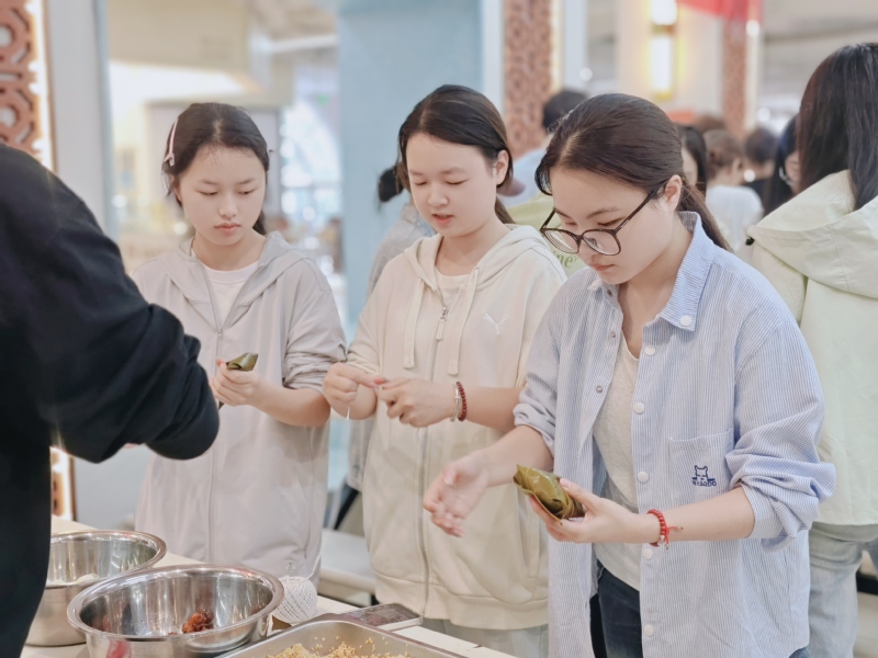 活动现场,粽叶飘香,气氛热烈。师生们围聚在一起,纷纷动手参与包粽子活动。捋粽叶、填糯米、放馅料、扎粽绳,一道道工序有条不紊。大家相互交流技巧,分享经验,欢声笑语不断。新手们在“老师”的指导下,从略显生疏到逐渐熟练,一个个形态各异却饱含心意的粽子在大家手中诞生。