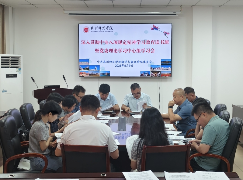 6月9日,海洋与食品学院在会议室召开深入贯彻中央八项规定精神学习教育专题读书班暨党委理论学习中心组学习会(第四次),持续深化学习《习近平关于加强党的作风建设论述摘编》和中央八项规定及其实施细则精神,重点学习《党政机关厉行节约反对浪费条例》以及《党的十八大以来深入贯彻中央八项规定精神的成效和经验》《八项规定改变中国》等重要文章。学院党委委员、各党支部书记、各系主任、各科室(实验中心)负责人参加会议,学院党委书记蔡志荣主持会议并作重点交流发言。