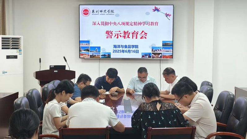 6月16日,海洋与食品学院在学院449会议室召开深入贯彻中央八项规定精神学习教育警示教育会,学院领导、党委委员、各党支部书记参加会议,学院党委书记蔡志荣主持会议并讲话。