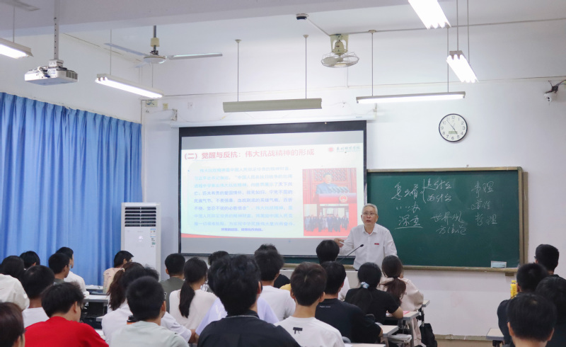 课堂上,陈晓风围绕“铭记历史汲取力量”“抗战精神当代传承”“青年如何传承精神”三个维度展开。他以抗日战争重要历史事件、关键时间节点为叙事脉络,通过翔实的史料数据、珍贵的历史图片,生动还原了那段山河破碎却斗志昂扬的深重记忆。他深入浅出地阐释了伟大抗战精神的丰富内涵与时代传承,点明了中国共产党是全民族抗战的中流砥柱,以及中华民族自立自强是生存发展根本、正义团结必胜的历史启示。同时鼓励大家以钱伟长、孟祥飞等为榜样,坚定理想信念、厚植爱国情怀、永葆奋斗精神、团结互助友爱,将个人理想与国家发展紧密结合,在新时代传承弘扬好伟大抗战精神。