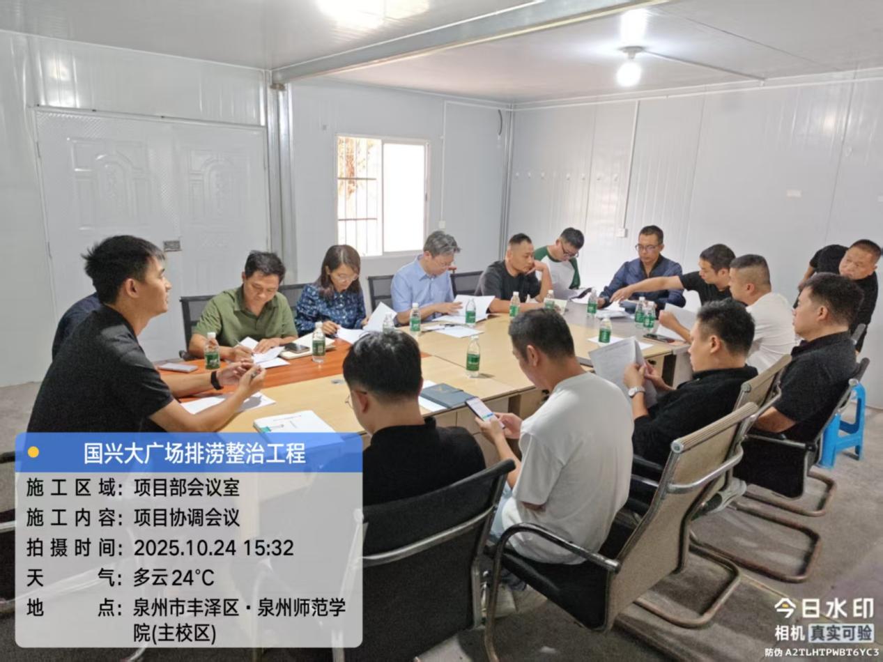 2025年10月24日下午,国兴大广场排涝整治工程开工协调会在项目部会议室举行。会议由建设单位泉州丰泽城建工程集团有限公司代表黄书训主持,设计、监理、施工单位及学校相关部门参加,围绕项目开工前的现场问题及协作事宜展开沟通。