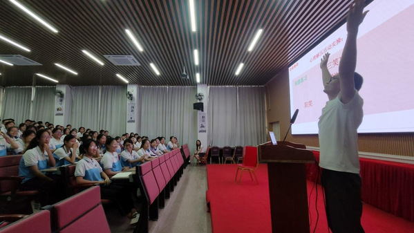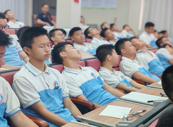 在实操环节,许志上老师和周星茹同学,通过动静结合,让师生体验三笑功、拍打、经典诵读和音乐冥想放松。