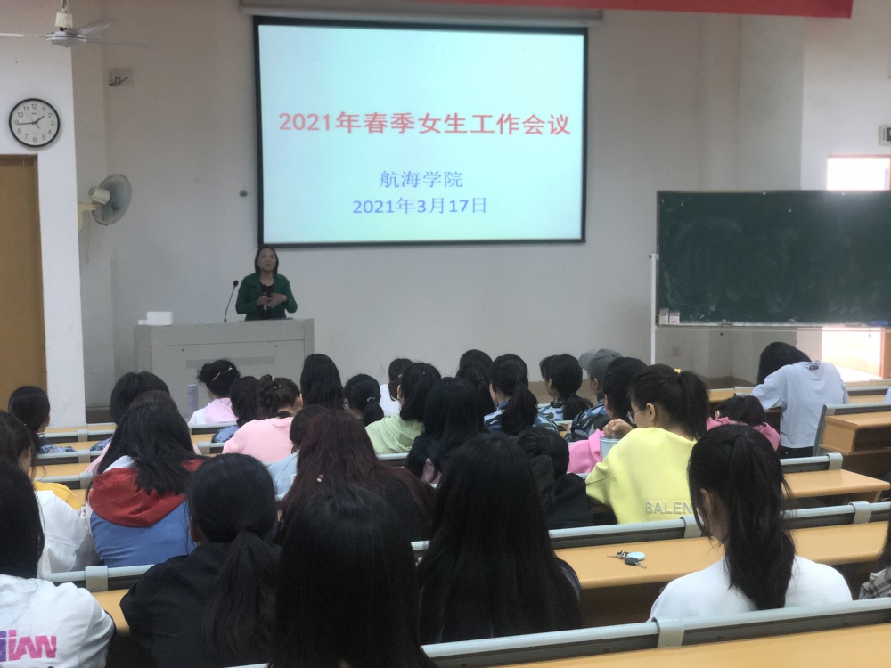 3月17日,航海学院在理工楼218教室召开2021年春季女生工作会议,传达学习上级有关做好校园安全稳定的通知精神,通报近期校园内外女生受伤害事件,安排部署女生安全教育工作。学院党委副书记陈霞红,全体辅导员,院级学生组织负责人及全院女生参加了会议。会议由学工办负责人主持。