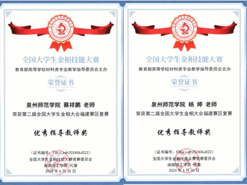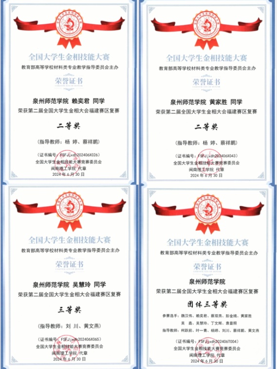 在此前进行的第十三届全国大学生金相技能大赛福建赛区复赛(省赛)中,轮机专业孙睿博(指导老师:刘川,黄文燕)获一等奖,汽车服务工程专业谭森林(指导老师:蔡祥鹏,杨婷)获二等奖,汽服黄家胜(指导老师:蔡祥鹏,杨婷)、汽车服务工程专业赖奕君(指导老师:蔡祥鹏,杨婷)获三等奖;在省赛的金相大会赛道,汽车服务工程专业赖奕君(指导老师:杨婷,蔡祥鹏)、汽车服务工程专业黄家胜(指导老师:杨婷,蔡祥鹏)获二等奖,轮机工程专业吴慧玲(指导老师:刘川,黄文燕)获三等奖,并取得团体三等奖的好成绩。蔡祥鹏、杨婷两位老师也分获优秀指导教师奖。