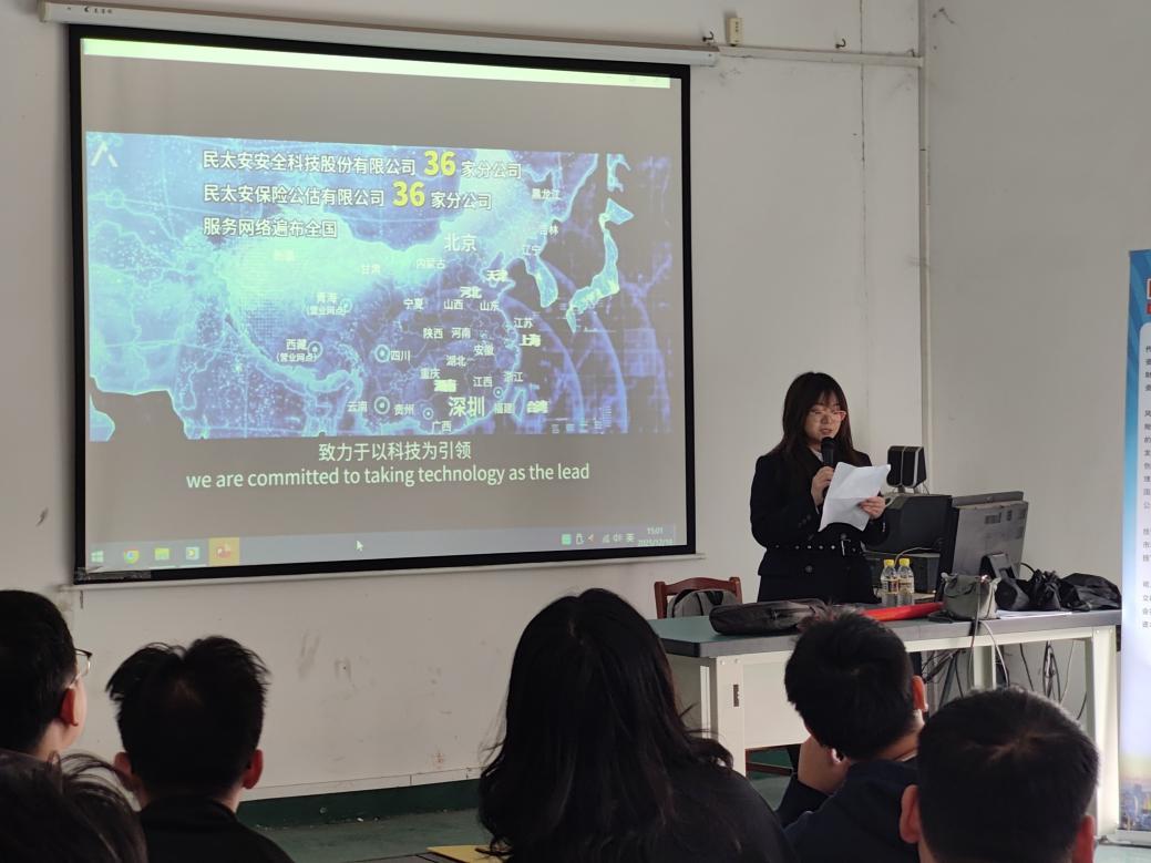 宣讲招聘会伊始,民太安保险公估有限公司厦门分公司运营支持部经理孙娟率先就企业文化与招聘计划进行宣传。她系统介绍了企业文化理念、荣誉资质、主营业务及业务分布,让同学们对公司的品牌实力与行业口碑建立了直观且清晰的认知;在招聘计划环节,她公布了面向2026届毕业生的理赔类招聘岗位、专业要求以及招聘人数,并具体讲解了薪酬结构、福利待遇与晋升路径,为同学们的职业规划提供了清晰指引。