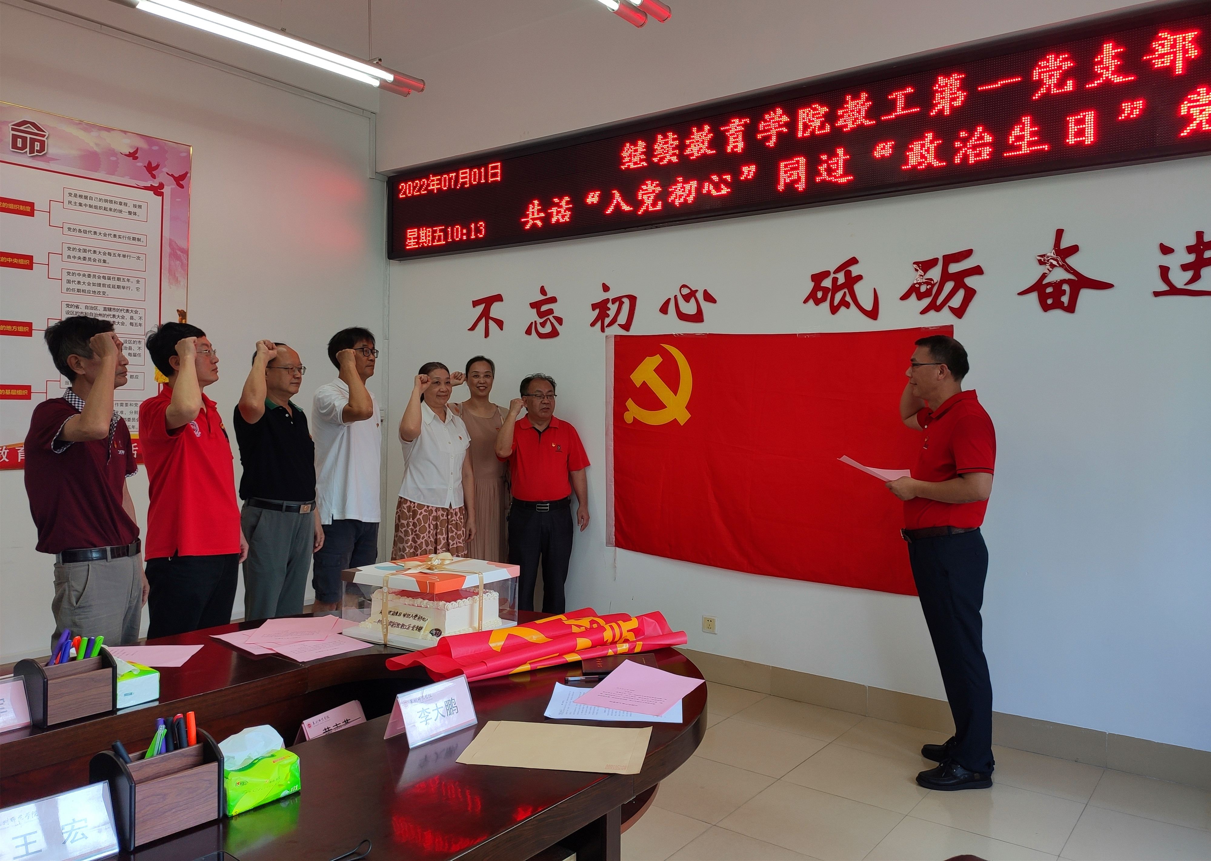 在中国共产党成立101周年之际,为进一步强化党员身份意识、宗旨意识和责任意识,切实发挥先锋模范作用,增强基层党组织的创造力、凝聚力、战斗力。7月1日,继续教育学院教工第一党支部组织开展“共话入党初心 同过政治生日”主题党日活动,重温入党誓词、讲述入党故事,品尝生日蛋糕,带领党员过 “政治生日”。学院党总支委员、副院长王宏受邀参加活动。