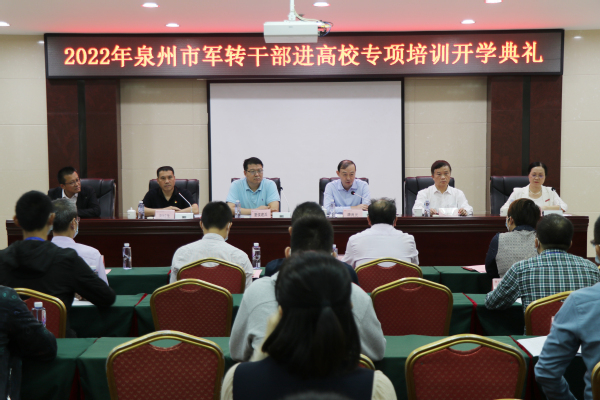 11月3日,2022年泉州市军转干部进高校专项培训开学典礼在我校举行。副校长夏侯建兵,泉州市委退役军人事务工作领导小组办公室主任、市退役军人事务局局长唐良元、泉州市教育局二级调研员毛伟雄等领导出席,我校军转干部专项培训领导组成员,相关二级学院负责人参加典礼。开学典礼由市退役军人事务局副局长刘红生主持。