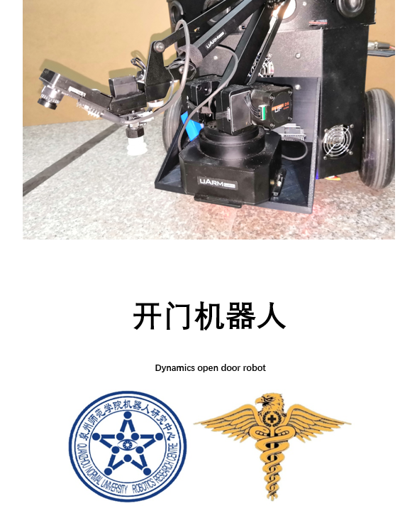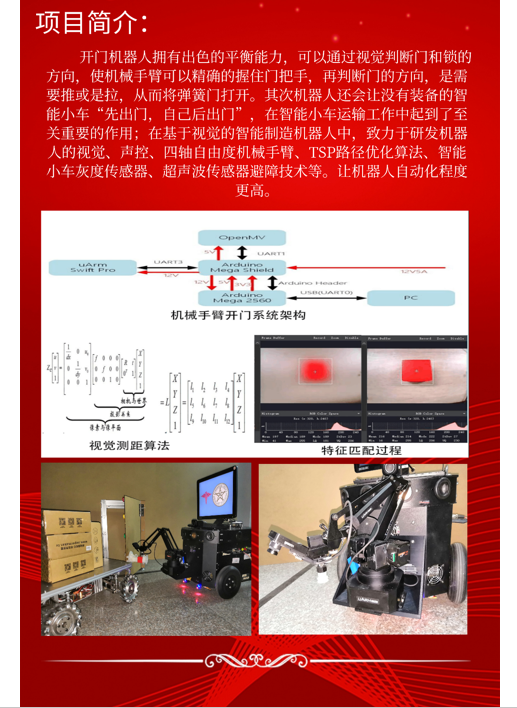 开门机器人拥有出色的平衡能力,可以通过视觉判断门和锁的方向,使用机械手臂可以精确的握住门把手,再判断门的方向,是需要推还是拉,从而将弹簧门打开。其次机器人还会让没有装备的智能小车“先出门,自己后出门”,在智能小车运输工作中起到至关重要的作用。在基于视觉的智能制造机器人中,致力于研发机器人的视觉、声控、四轴自由度机械手臂、TPS路径优化算法、智能小车灰度传感器、超声波传感器避障技术等。