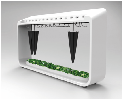 本实用新型公开了一种具有提醒功能的伞具寄存装置,包括伞架可弯曲的识别卡和控制器,伞架的上侧设有放置伞具的伞具放置部,伞具放置部对应设有用于将伞具锁固的锁固装置,伞架上对应于伞具放置部处设有操作部,操作部包括寄存按钮和用于吞吐识别卡的出卡口,识别卡内置有振动器和供所述振动器工作的电池;寄存按钮的控制端与控制器的相应输入端电连接,控制器与锁固装置的驱动端电连接;控制器和识别卡内分别具有已经过相互匹配的蓝牙装置,振动器的输入端均与控制器通过蓝牙进行通信连接。于现有技术相比,此伞具寄存装置具有提醒寄存者取回伞具的功能。产品外观结构设计完整,可进行手板制作和小批量试产。(专利号:ZL 2016 2 1273046.1