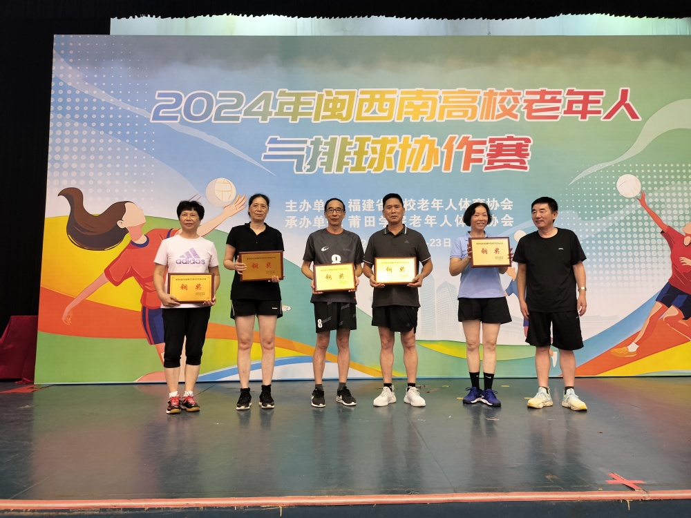 6月22日至23日,2024年闽西南高校老年人气排球协作赛在莆田学院学园校区文荣体育馆举行,此次比赛由福建省高校老年人体育协会主办,由莆田学院老年人体育协会承办。我校老体协选派9名退休教师首次参加闽西南高校老年人气排球协作赛,荣获男子组铜奖。