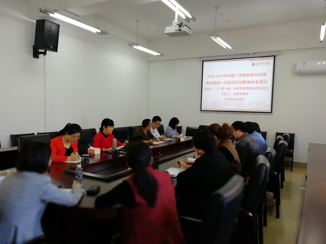 2019年3月28日,马克思主义学院形势与政策教研部在文科楼A414室成功举行2018-2019学年第二学期第一次教研活动暨“一带一路”:从总体布局到走深走实(专题1)集体备课会。本次集体备课会邀请刘琼华教授做辅导授课。刘教授从教学目标、教学重点、教学过程中需要厘清的几个概念与教学方法等四个方面向各位任课教师们做了全面辅导,帮助大家能够更好地吃准吃透本专题的教学内容,进而促进课堂教学质量不断提高。