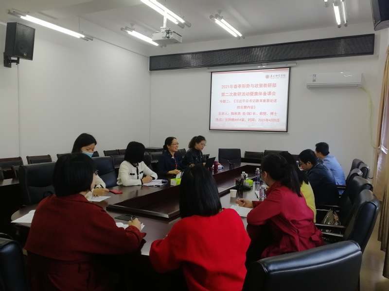 2021年4月8日,马克思主义学院形势与政策教研部举行2021年秋季第二次教研活动暨“习近平总书记教育重要论述的主要内容”(专题二)集体备课会,集体备课会再次邀请学校继续教育处(学院)处(院)长陈秋燕教授、博士到会做辅导报告。