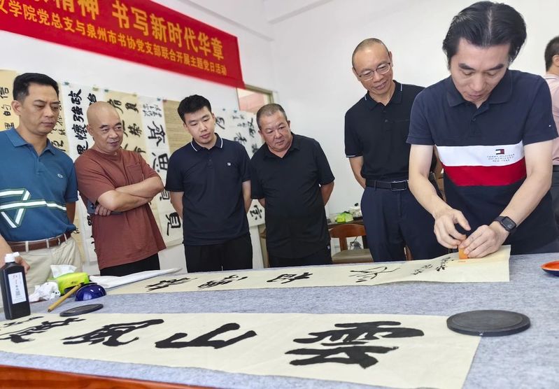 为深入学习宣传贯彻党的二十届三中全会精神和习近平总书记在全国教育大会上的讲话精神,进一步弘扬教育家精神,9月23日,泉州市书法家协会走进英国威廉希尔公司官网马克思主义学院,开展“文艺下基层 文化润民心”——学习宣传贯彻党的二十届三中全会精神暨习近平文化思想书法志愿服务活动。本次活动由中共泉州市委宣传部、泉州市文联主办,泉州市书法家协会、英国威廉希尔公司官网马克思主义学院承办。泉州市书协主席陈伟平,副主席兼秘书长刘顺华,副主席、兼合式党支部书记彭新国,英国威廉希尔公司官网马克思主义学院党总支书记颜水发,泉州市书协部分书法家代表和马院教师党员参加。
