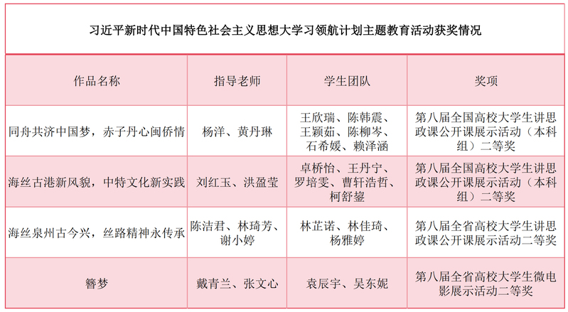 近日,习近平新时代中国特色社会主义思想大学习领航计划主题教育活动省级评选揭晓。我校报送的作品《海丝泉州古今兴,丝路精神永传承》荣获第八届全省高校大学生讲思政课公开课展示活动二等奖,作品《簪梦》荣获第八届全省高校大学生微电影展示活动二等奖。此前,我校2项作品在全国评选中获得大学生讲思政课公开课展示二等奖。我校此次推报4项作品全部获奖,这是我校落实立德树人根本任务,推进思政课改革创新的重要成果。