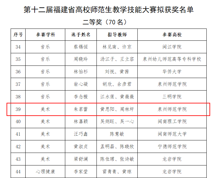 近日,由福建省教育厅主办、宁德师范学院承办的第十二届福建省高校师范生教学技能大赛圆满落幕。我院2022级美术学(师范)专业朱茗蕾同学(校内指导教师:黄思阳、周林坪,校外指导教师:泉州一中岳彩瑞)代表学院征战初中美术组赛场,凭借深厚的专业素养、扎实的实践功底以及出色的应变能力,在激烈角逐中脱颖而出,斩获二等奖第一名的优异成绩。