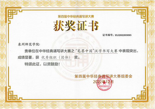 福建省第四届诵写讲大赛“笔墨中国”汉字书写大赛由我校承办,我校语委办、国家语言文字推广基地高度重视、积极筹备,认真组织广大师生选拔优秀参赛作品,组织专家围绕活动主题对参赛选手开展线上、线下指导,近两万人参加线上选拔,近千人参加省级现场赛,最后选送了四百人参加国赛,保证赛事圆满完成。今后,我校将继续以赛事为契机激发师生学习兴趣,助推全校师生语言文字能力不断提升。(语委办、国家语言文字推广基地)