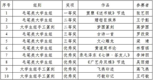 近日,由教育部、国家语委主办的第四届中华经典诵写讲大赛获奖名单公布,我校张艺朋等10位同学在汉字书写大赛、师生篆刻大赛中获得一等奖1项,二等奖2项,三等奖2项,优秀奖5项,王守民老师获汉字书写大赛优秀指导教师,学校获得“笔墨中国”汉字书写大赛优秀组织(团体)奖。