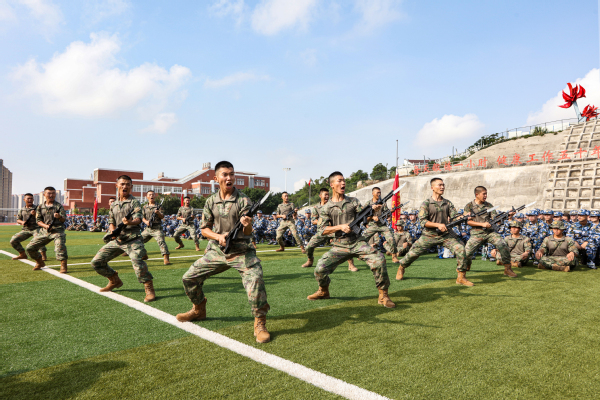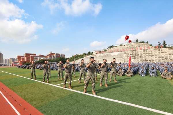 军训团团长江新锋、音乐与舞蹈学院学生陈婧分别代表全体教官和参训学生发言。军训教官展示了匕首操、格斗术、刺杀操等3个课目的训练内容。