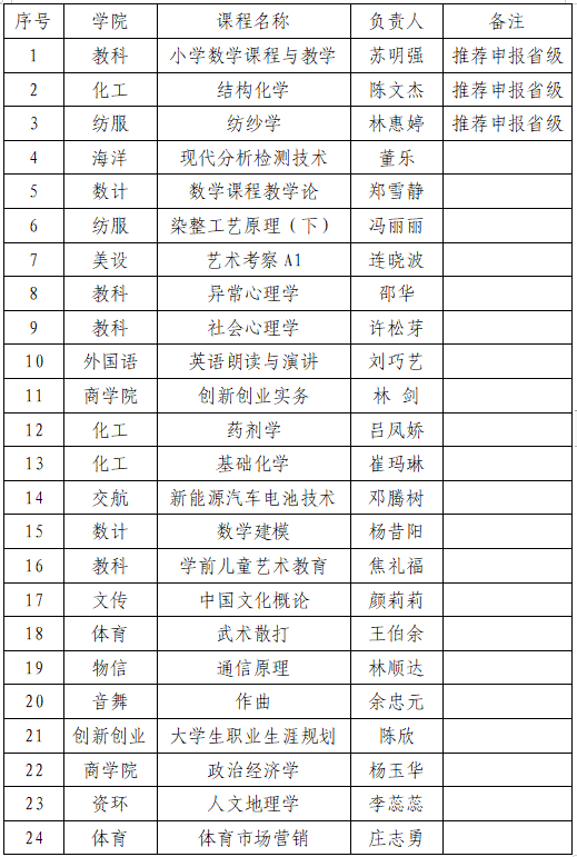 根据《福建省教育厅办公室关于开展第三批课程思政示范项目建设工作的通知》(闽教办高〔2023〕7号)和《英国威廉希尔公司官网关于开展课程思政示范项目建设工作的通知》(教务〔2023〕30号)文件精神,教务处组织了课程思政示范项目的申报工作,共收到39个课程思政示范项目的申报材料。经校外专家评审,学校教学工作委员会函审,拟遴选建设24个校级课程思政示范项目,并择优推荐苏明强“小学数学课程与教学”等三门课程,申报福建省第三批课程思政(本科生教育)示范项目,具体名单详见下表,现予以公示。