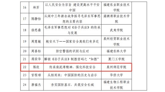 近日,福建省教育厅办公室公布2024 年福建省军事课教师微课教学竞赛获奖名单,我校马克思主义学院陈欣副教授荣获三等奖。
