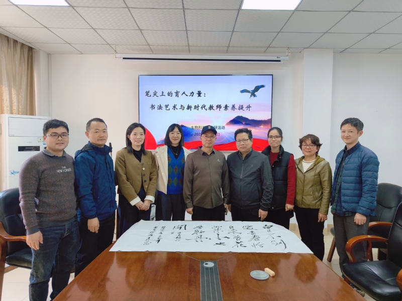 在新时代教育背景下,教师的综合素养不仅体现在教学能力上,更体现在文化底蕴与人格魅力的塑造中。书法作为中国传统文化的精髓,不仅是艺术的表达,更是修身养性、陶冶情操的重要途径。3月20日下午,我院生物科学教研室举办“笔尖上的育人力量”主题研修活动。蒋国芳教授执笔挥毫间,将传统书法艺术与新时代教师素养培育巧妙相融,为全体教师呈现了一场独具匠心的文化盛宴。现场墨香氤氲,笔锋流转,理性严谨的生物科学与灵动深邃的传统艺术在此碰撞交融。