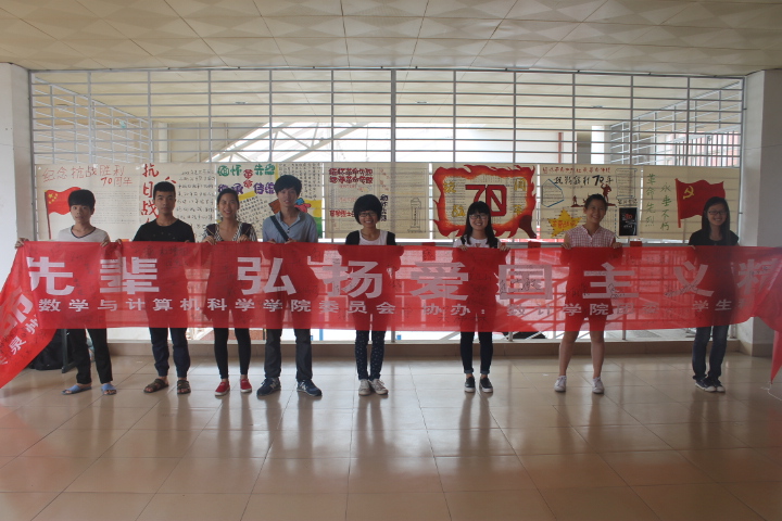 为纪念抗日战争胜利七十周年,我院举行了以“缅怀革命先烈继承革命传统”为主题的手抄报比赛,并将比赛作品于5月28日展示在荣助实验楼三楼进行票选,同时进行横幅签名活动。本次活动由数学与计算机科学学院党委主办,数计学院团委会学生科协办。