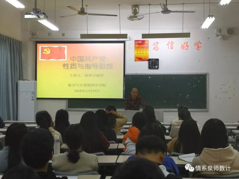 12月19日晚7点,数计学院分党校第十四期党的基本知识培训班第二课在理工416顺利开课。此次党课以“中国共产党的性质与指导思想”为主题,数计学院院长陈明玉教授主讲,46名入党积极分子参与了本次课程。
