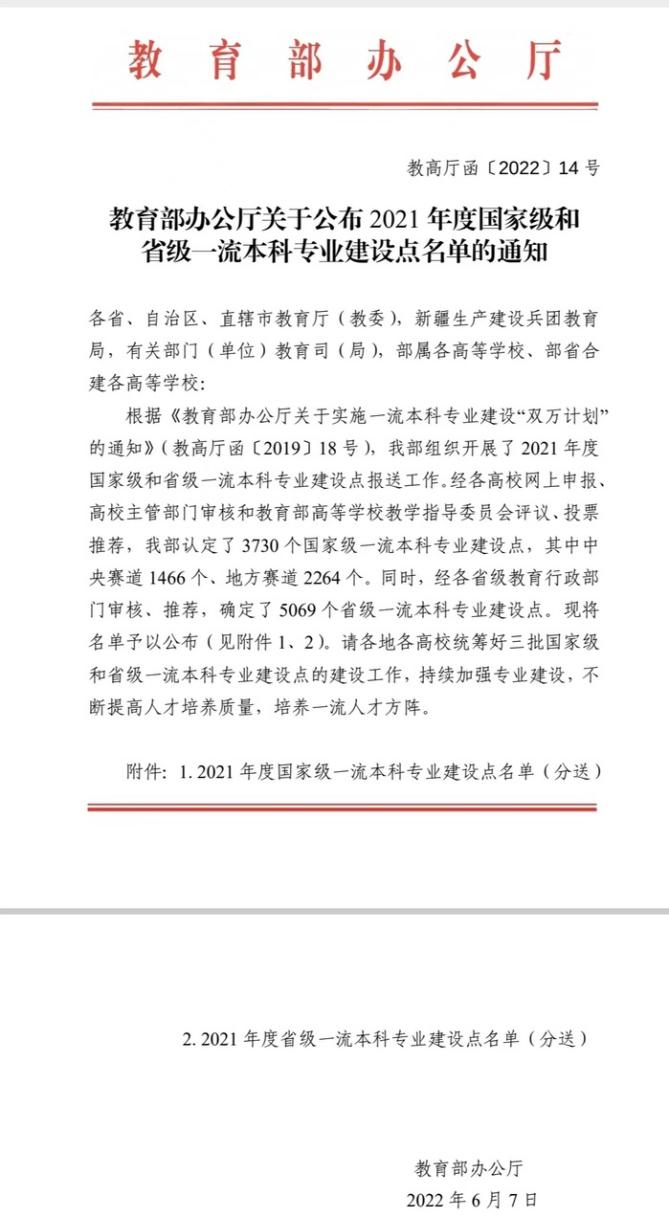 近日,教育部办公厅印发了《关于公布2021年度国家级和省级一流本科专业建设点名单的通知》(教高厅函〔2022〕14号),数学与计算机科学学院计算机科学与技术专业入选2021年度国家级一流本科专业建设点。