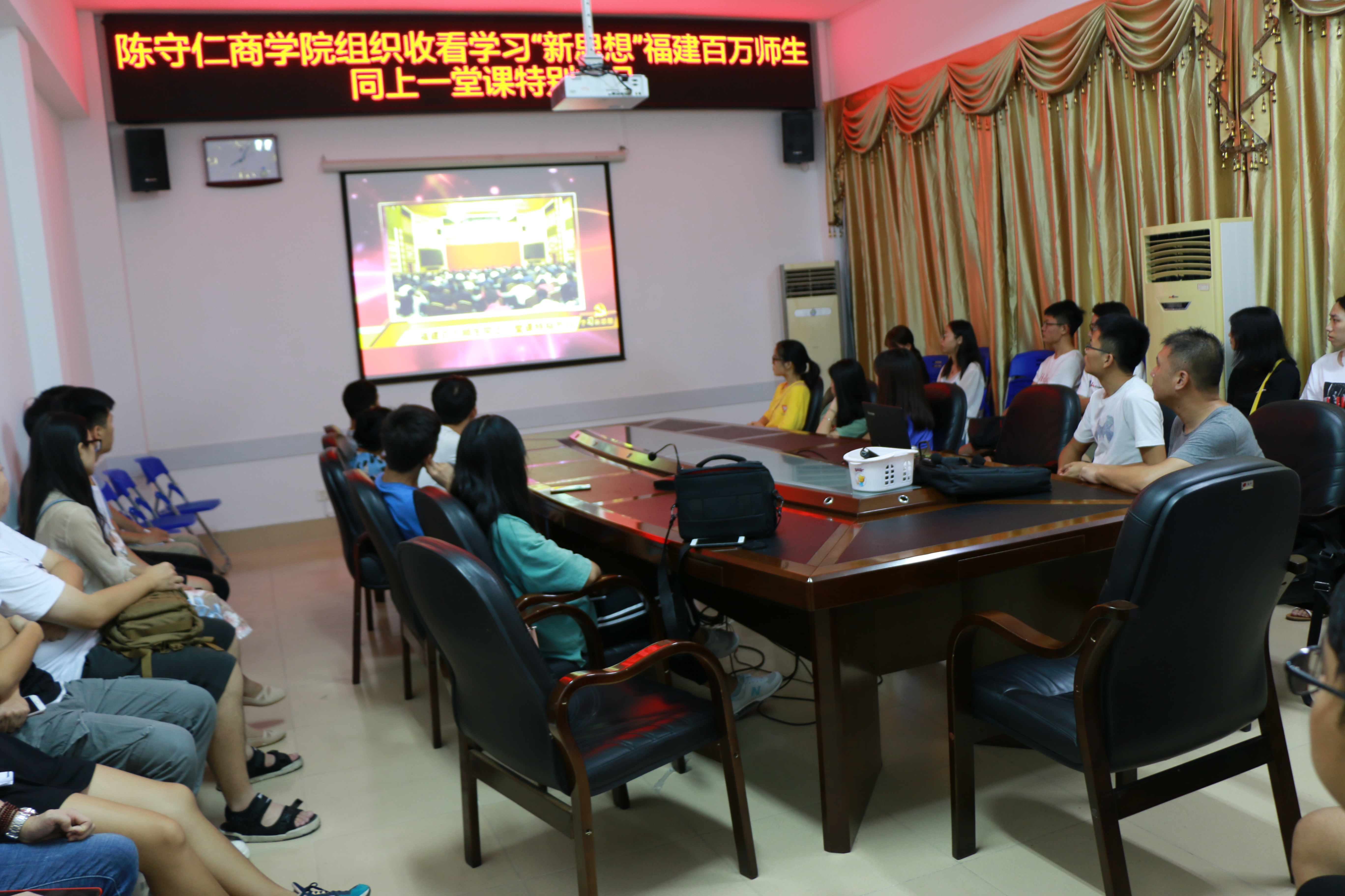 为推动学习习近平新时代中国特色社会主义思想活动的深入开展,我院于9月3日晚组织16、17级学生干部共同观看了福建教育电视台摄制的“学习新思想,福建百万师生同上一堂课特别节目”。我院学工办负责人刘礼元老师主持本次学习活动。