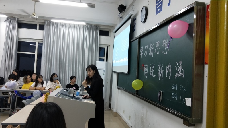 班会上,各班级通过事先整理好的习近平总书记经典语录,用PPT播放视频、展示文字内容,带领同学深入学习新思想的精髓;各班学生通过表演班会节目以及进行游戏互动,活跃班级气氛,展现大学生良好的精神风貌。班会结束之前,各班团支书归纳概括了习近平新时代中国特色社会主义思想的形成与发展过程,并简要说明了其核心内容。