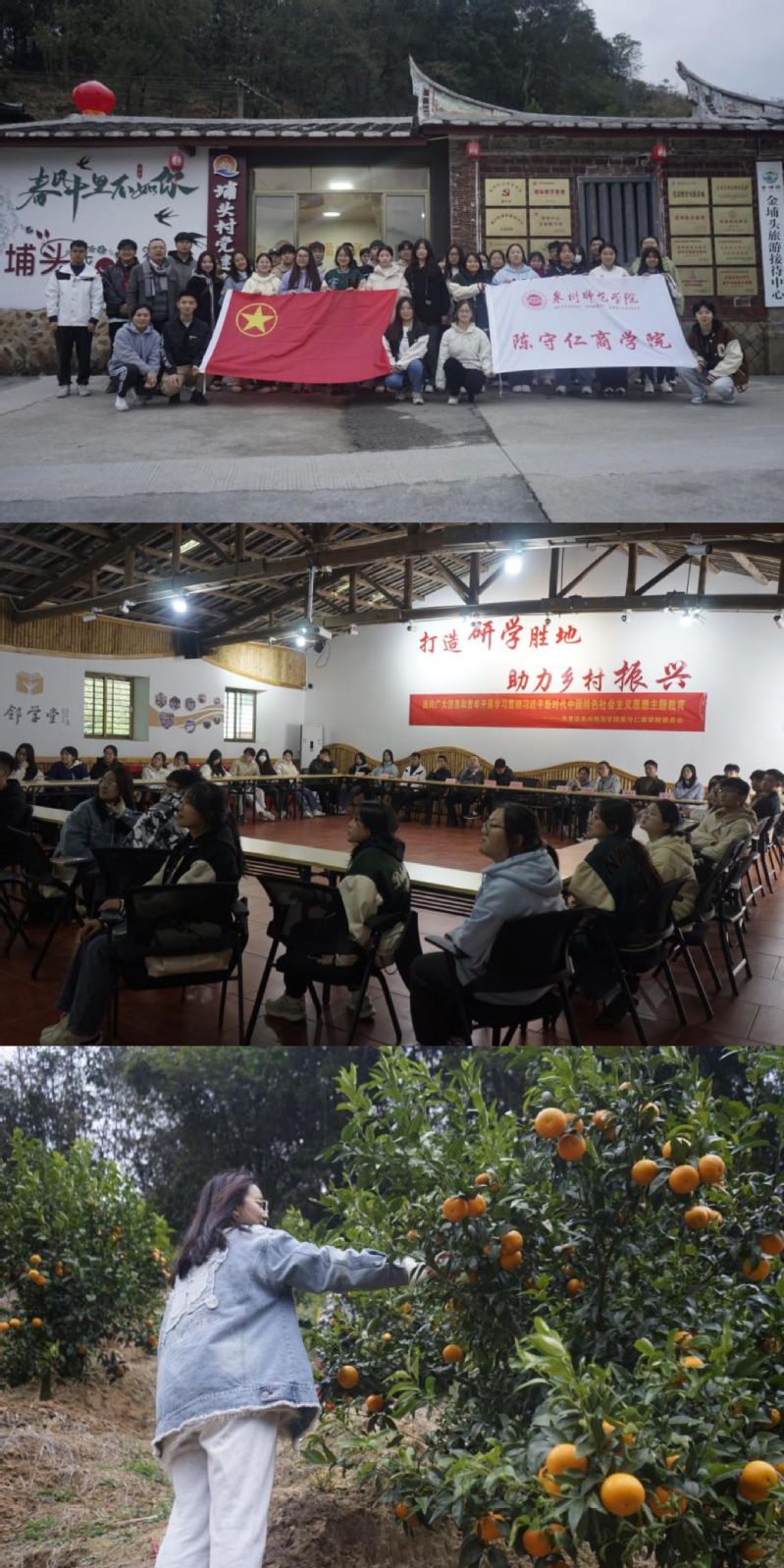 实践队在永春县五里街镇埔头村,深入探访当地“现代农业+文化体验+研学旅游”的乡村振兴新模式。埔头村作为福建省省级乡村振兴试点村,充分运用“村企联建、村民共建”优势,大力发展现代休闲农业。村中风光秀美,景色旖旎,实践队师生在村干部的带领下,参观走访埔头村“党建+”邻里中心,详细了解当地村情村貌、历史文化、果蔬产业、乡村旅游,并体验了芦柑、草莓等特色农产品。在分享交流会上,大家通过观看埔头村乡村振兴宣传片,感受“绿水青山就是金山银山”的魅力,村干部与同学们深入交流乡村振兴的经验,现场回答同学们提出的问题,并表达了对当代青年的深切期盼,希望青年大学生走进群众,用自己所学振兴乡村。
