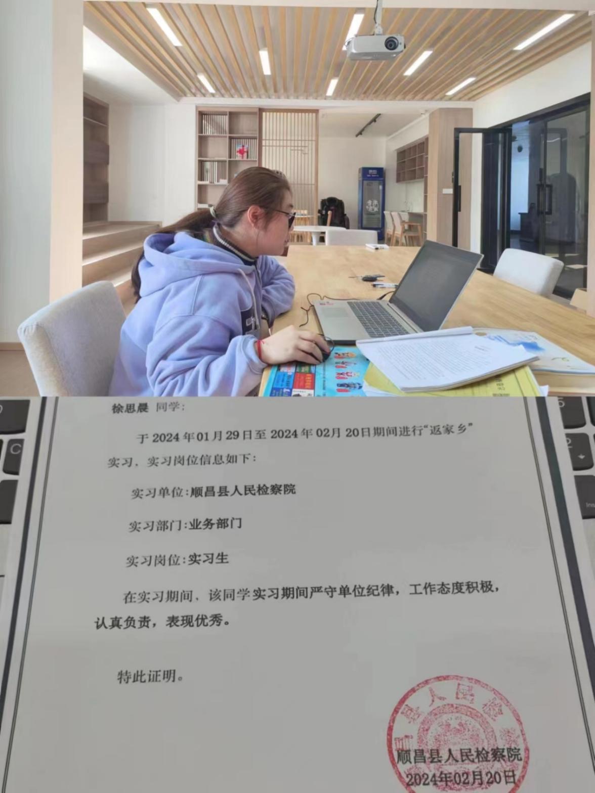 徐思晨,陈守仁商学院2022级知识产权专业学生。她参加福建省大学生“返家乡”活动,担任福建省南平市顺昌县人民检察院实习生。在实习过程中,负责整理卷宗材料,书写检察院审查报告与检察建议书。同时,在检察官带领下,参与提审工作,并参加观摩法院庭审工作。在此次工作中,她学习许多业务知识,也在实践中成长,进一步提高了自身待人处事的能力。