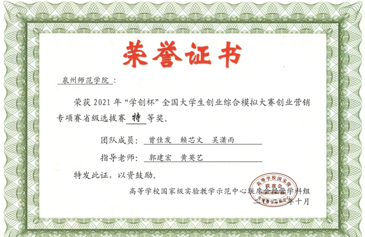 学生曾获“挑战杯”全国大学生创业计划竞赛铜奖、“微小店”全国大学生移动互联网创业营销大赛福建赛区亚军、正大杯市场调查实践大赛一等奖等奖项。截至2024年12月,累计向社会输送1100多名高素质应用型人才。